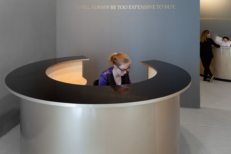 Performance: three embossed gold vinyl wall texts on 70% grey walls; three circular gold reception desks,