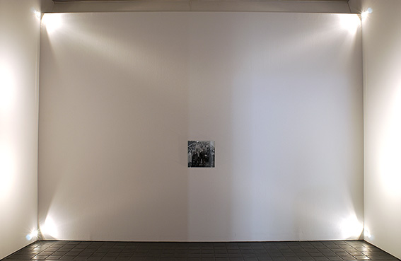 black and white photograph framed under reflective Plexiglas, 18 x 18” (45.7 x 45.7 cm); audio tape, lighting.