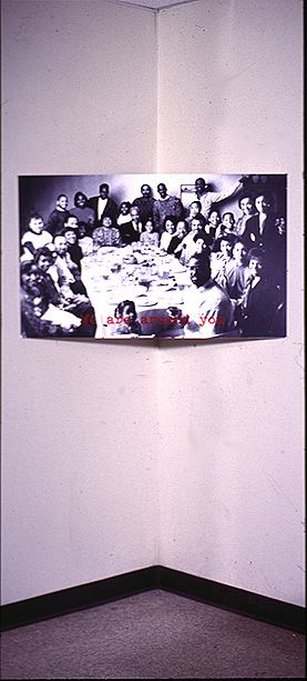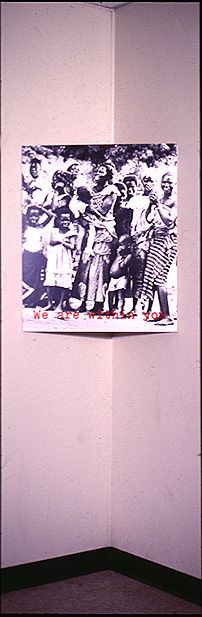 track with 4 panels, each black and white photo with silkscreened text, mounted on foamcore