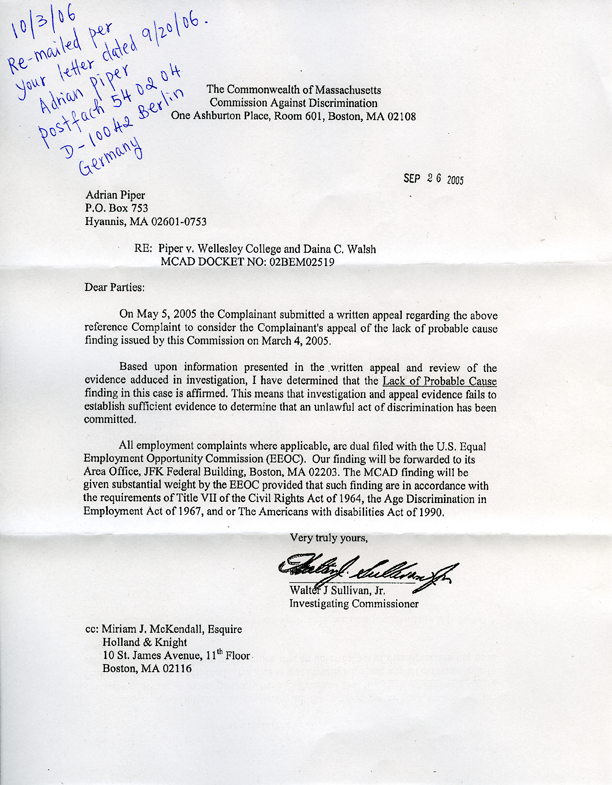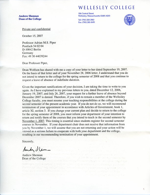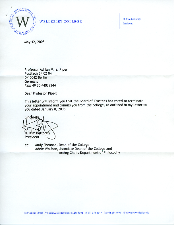 goes into administrative receivership under supervision of Associate Dean of The College. Dean of The College charges $9,000.00 worth of health insurance premiums retroactively to July 2005, demands immediate payment. Piper finishes Rationality and the Structure of the Self. Finishes Unite. Begins final revisions on Kant’s Metaethics: First Critique Foundations of His Theory of Action. Reads Hitler’s Mein Kampf. Reads Muhammad Yunus’ Banker to the Poor. Attends sixth Gesellschaft für Analytische Philosophie Kongreß at the Freie Universität Berlin. Notifies MCAD of decision not to return to continuing hostile environment at Wellesley. MCAD “resends” notification of September 2005 dismissal of charges. Requests Substantial Weight Review of case by U. S. Employment Equal Opportunity Commission (EEOC). Delivers keynote address, “Criticizing the Critics” at Frieze Art Fair, London. On U.S. lecture tour, delivers “Passing Beyond Passing,” “The Ideal of Agent Integrity,” and “Why Shiva Dances” in Austin, Santa Fe, Minneapolis, and Bloomington, discovers name on U.S. Transportation Security Administration’s Suspicious Traveler (SSSS) Watch List. Returns to Berlin, notifies Wellesley College of SSSS List and requests indefinite leave of absence. College denies request, threatens termination of employment as tenured full professor.