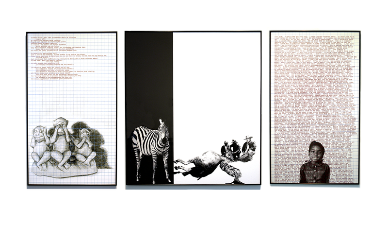 Decide Who You Are #1: Skinned Alive (1992; Photo-Text Collage. 3 Panels, 182.8 x 388.6 cm total). Private collection.