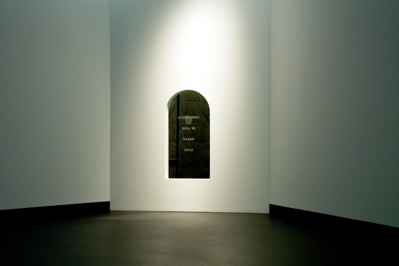 Everything #5.2 (2004; fabricated 2009, Haus der Kulturen der Welt. Mixed media installation: wood construction, plexiglass engraved with gold leaf text, lighting). Collection Adrian Piper Research Archive Foundation Berlin. Photo credit: Andrej Glusgold
