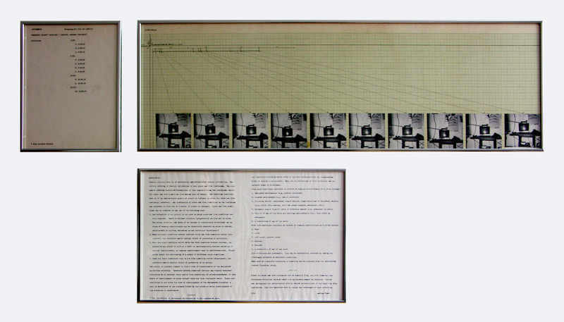 Hypothesis: Situation #3 (for Sol LeWitt) (1968; photo-chart collage on graph paper, original typescript, vintage photo offset text, 28.4 x 86.5 cm; 28.4 x 22.1 cm; 28.5 x 43.6 cm). Collection Adrian Piper Research Archive Foundation Berlin. Photo credit: Amy Patton