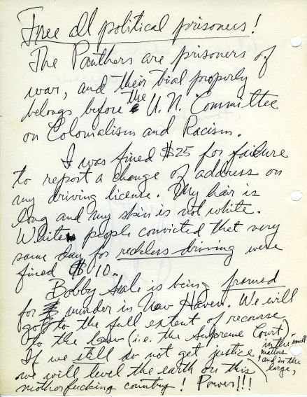 Context #7, 1970. 7 black notebooks with pages, ink, graphite, crayon, postage stamps, photograph, sugar package on paper. Each 11.75 x 11 x 3” each, (29.84 x 27,94 cm each). #70008. Detail: Free All Political Prisoners. Collection Walker Art Center. © Adrian Piper Research Archive Foundation Berlin.