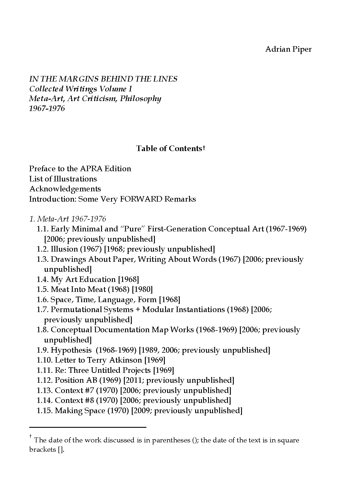 Adrian Piper began to write meta-art about her own artwork in 1967 to make sense of her artistic activity. She
